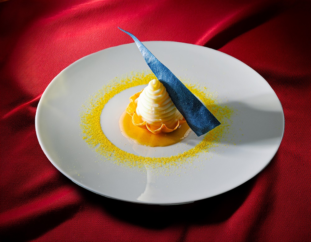 パンプキンパウダーのチュイルを添え、かぼちゃの馬車を表現しています。