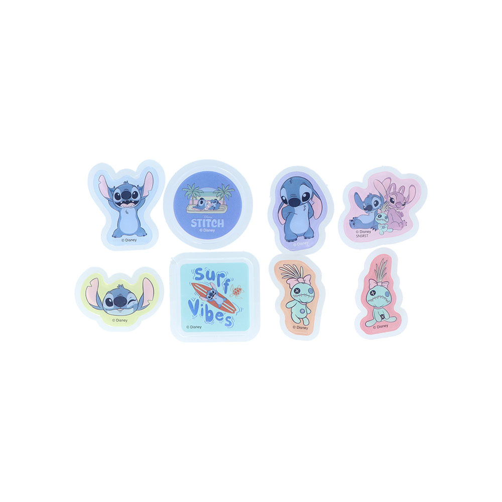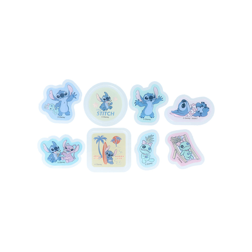 「スティッチ」や「エンジェル」「スクランプ」が寄り添う姿など、全8種のシールがアソートされています。