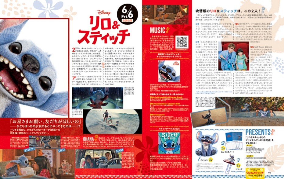 映画の紹介ページはもちろん、「スティッチ」のイトコたちにフォーカスした特集や、ディズニーストアや全国のお店で発売予定のグッズ、