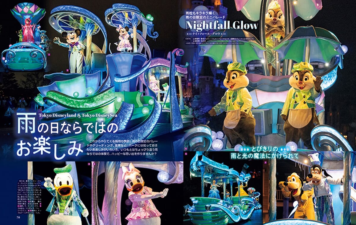 雨の日限定のパレードやグリーティング、風景など、知っておきたいパークの楽しみ方をたっぷり紹介。