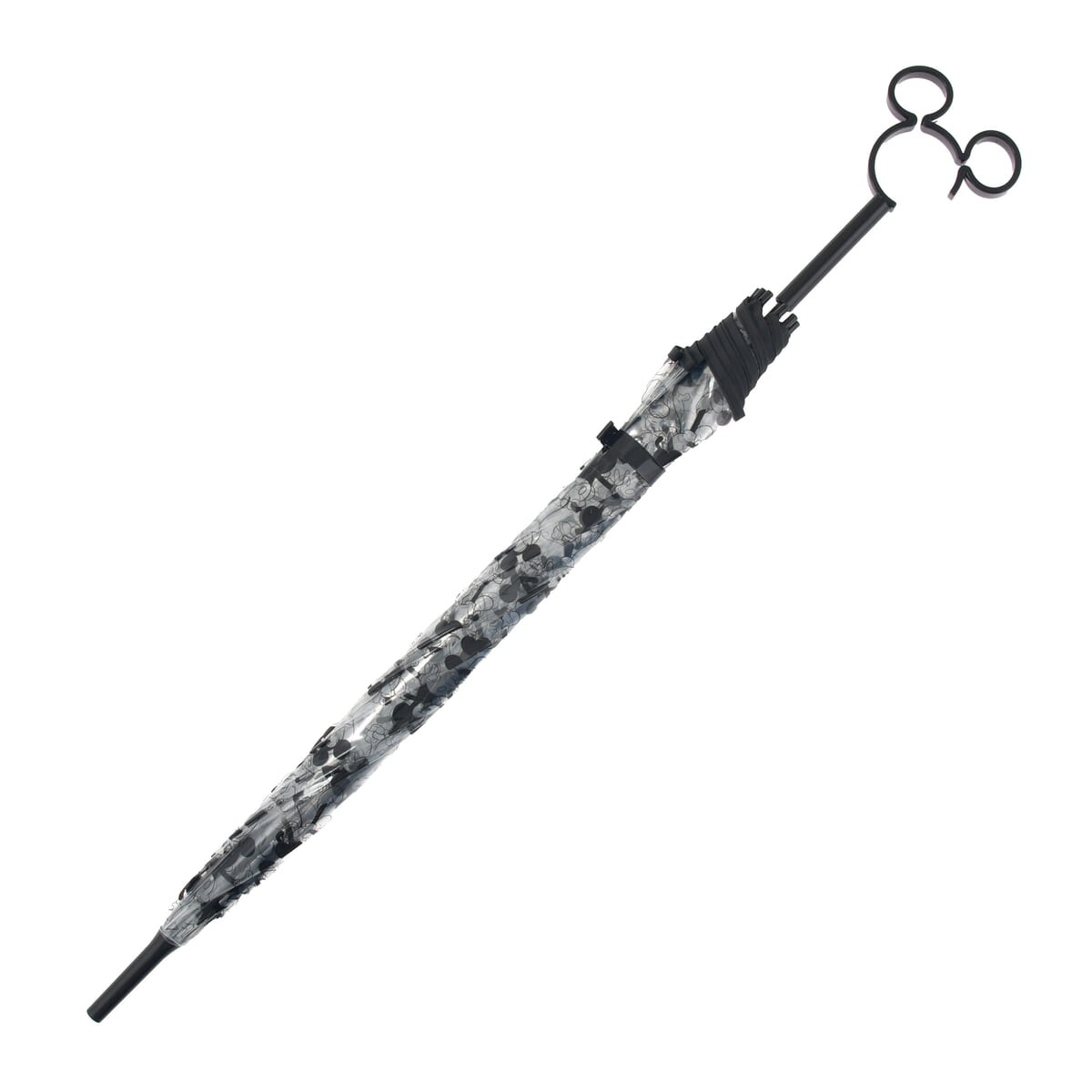「ミッキーマウス」を全面にプリントした、透明なビニール傘。