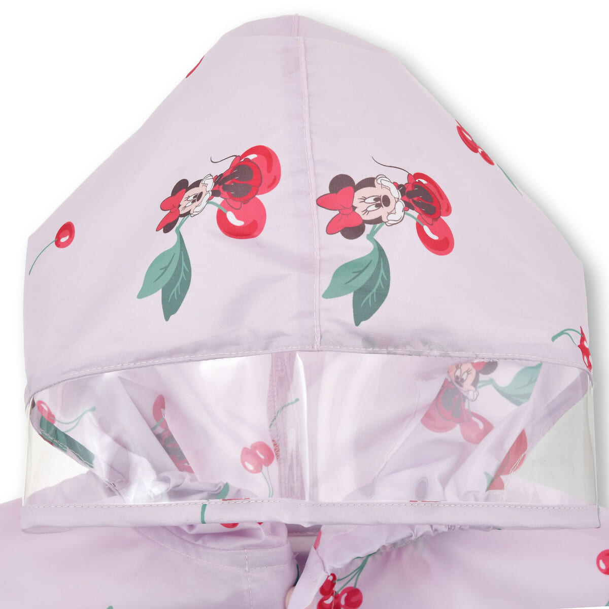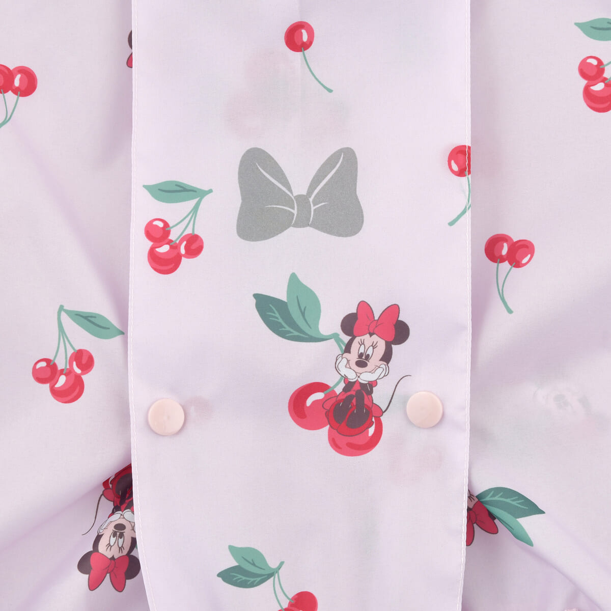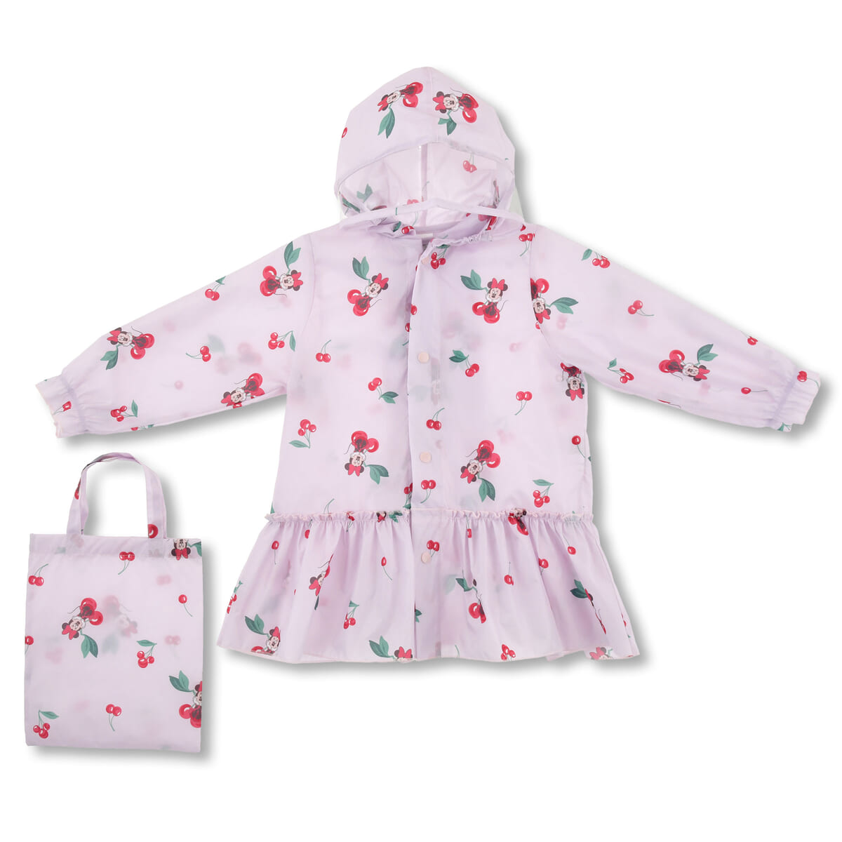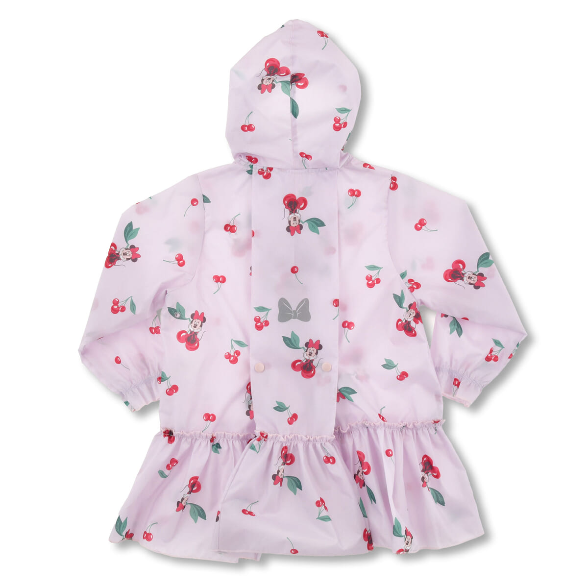「ミニーマウス」とチェリー柄デザインの、ランドセルやバックパックを背負ったままでも着られるキッズ用レインコート。