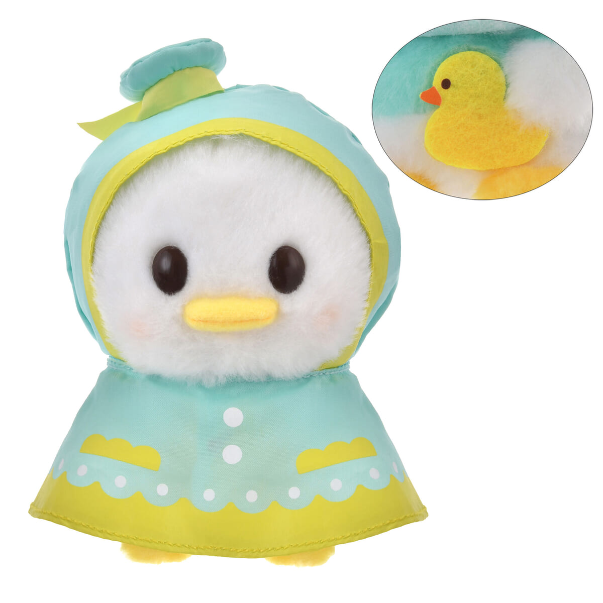 フードは着脱可能で、ポンチョの裾をめくると、てるてる坊主やアヒルなどそれぞれキュートな持ち物がついているサプライズにも注目です。