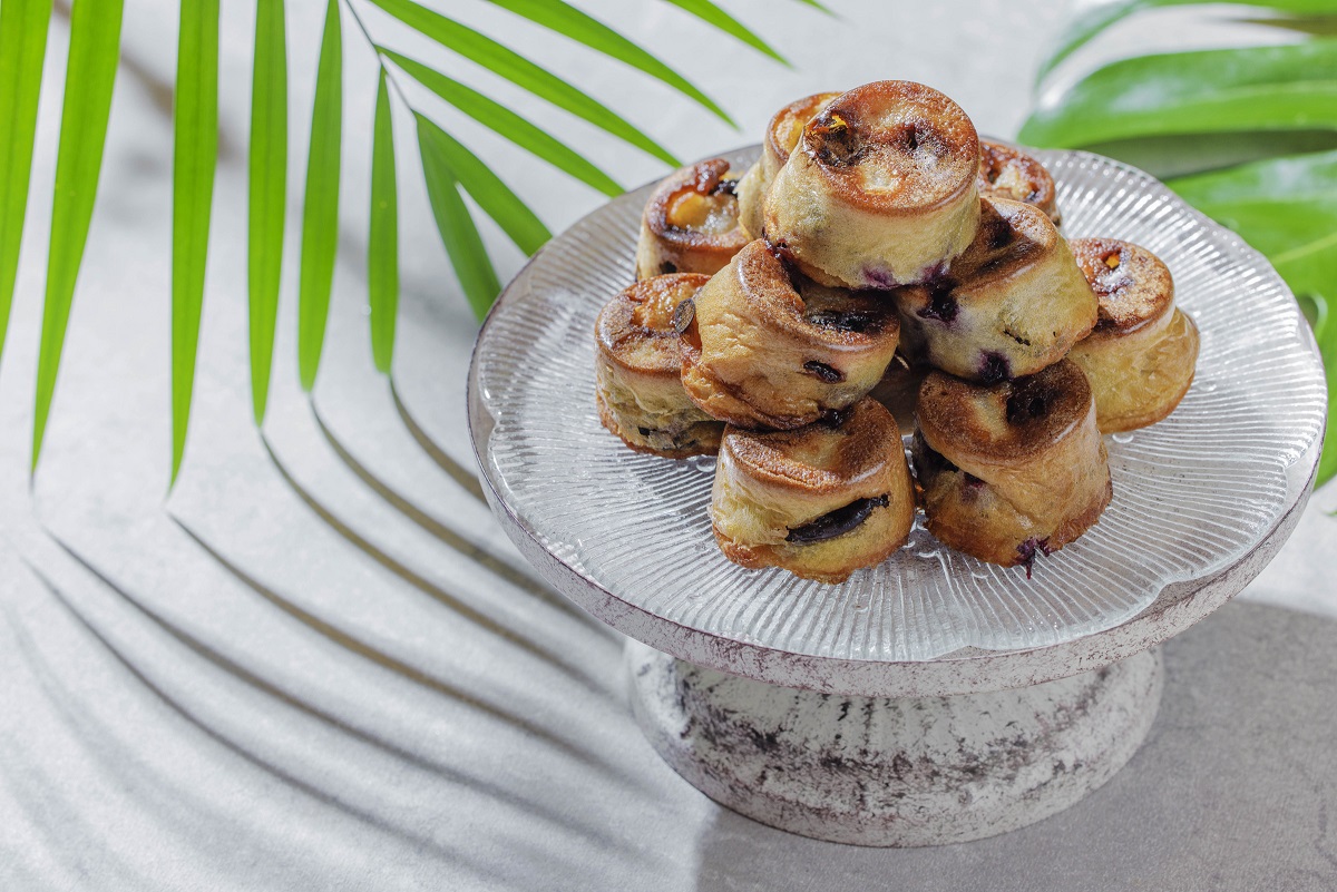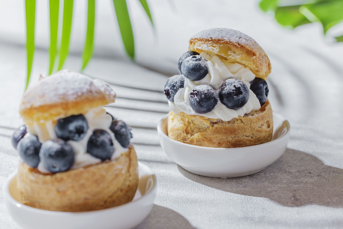 「ブルーベリーシュークリーム」は、芳醇なブルーベリージャムとなめらかなディプロマットクリーム、フレッシュなブルーベリーの爽やかなハーモニーが楽しめます。