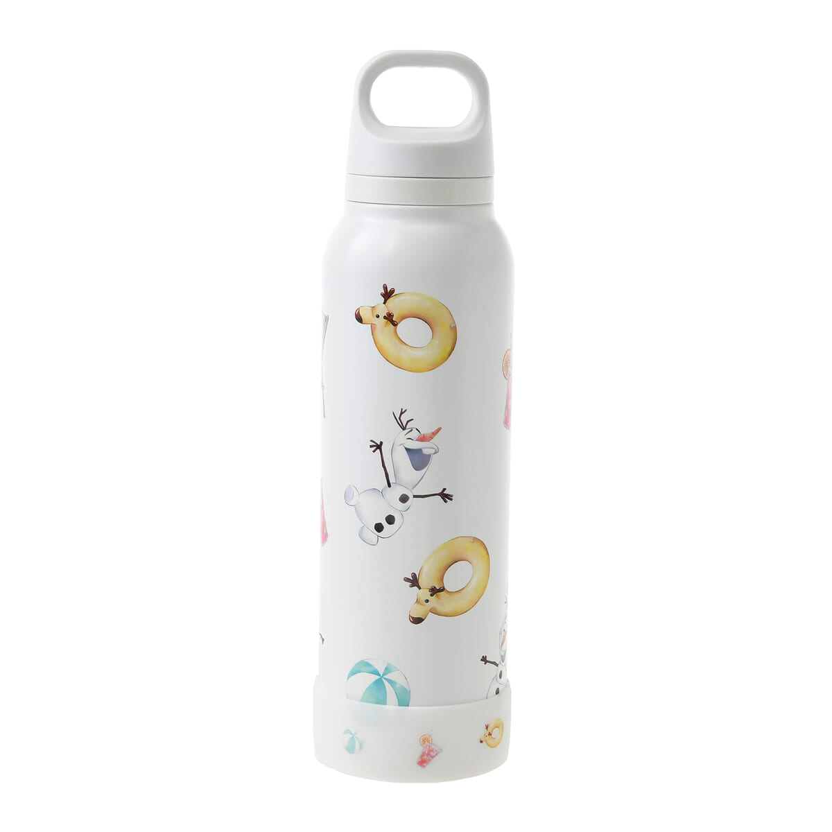 「オラフ」や浮き輪、ビーチチェア、ビーチボール、冷たいドリンクのイラストを散りばめた総柄のステンレスボトル。