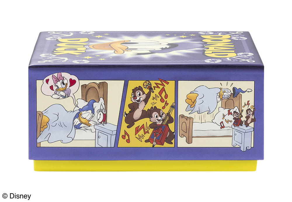 ベレー帽とお揃いのブルーを基調としたデザインで、側面には「デイジーダック」とのデートの朝が描かれています。