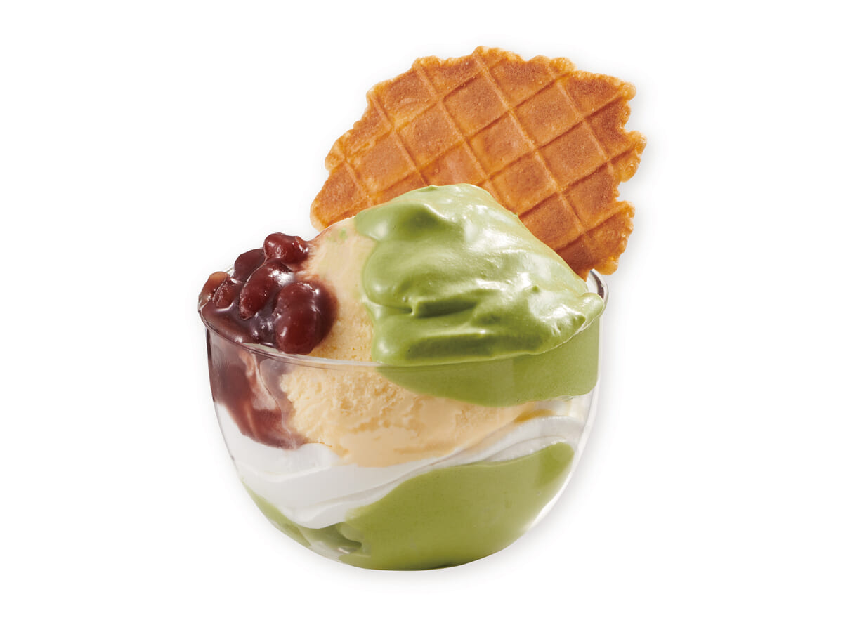 抹茶クリームには香り高い国産宇治抹茶を使用し、カスタードワッフルチップや、ゆであずき、バニラアイス、ホイップ、抹茶プリンを使った満足感のある和パフェです。