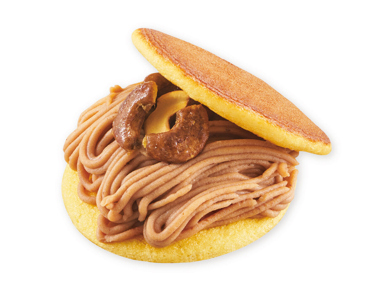 どら焼きに、濃厚なモンブランクリームとカリッと食感が楽しめる飴かけのナッツを挟んでいます。