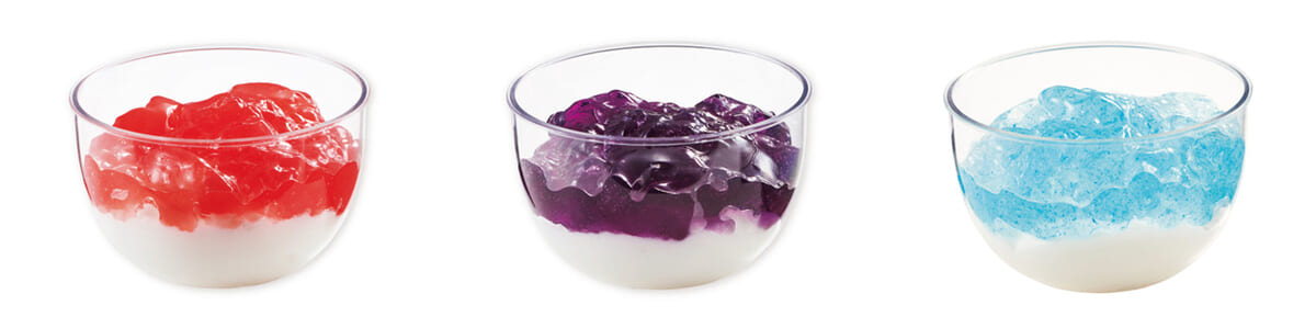 それぞれ甘酸っぱいヨーグルトムースが土台にあり、赤色がイチゴ風味のゼリー、紫色がブドウ風味のゼリー、水色がサイダー味のゼリーとなっています。