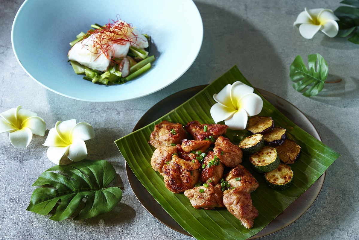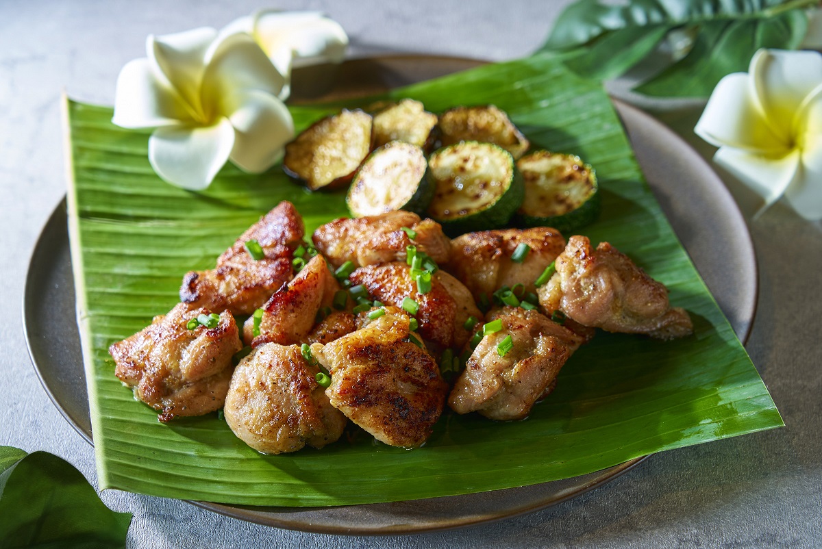 ほかにも、目の前でダイナミックに切り分ける「ハワイアン グリルチキン」や「バナナの葉で包んだ山百合ポークのロースト パイナップルソテー添え」