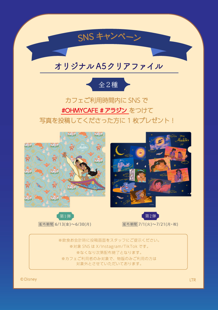 XまたはInstagramまたはTikTokでカフェ店内もしくは飲食メニュー写真に「#OHMYCAFE」「#アラジン」をつけて投稿された方に先着で1枚プレゼントされます。