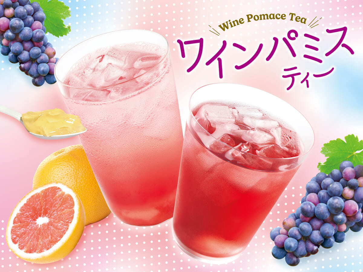 「ワインパミスティー(ホット/アイス)」と「ピーチジェリー in ソーダ グレープフルーツ&ワインパミスティー」で使用しているアップサイクル原料「ワインパミス」は、ワインの製造工程で生じるブドウの果皮などのことで、ぶどうの皮や種由来のポリフェノールが豊富に含まれています。