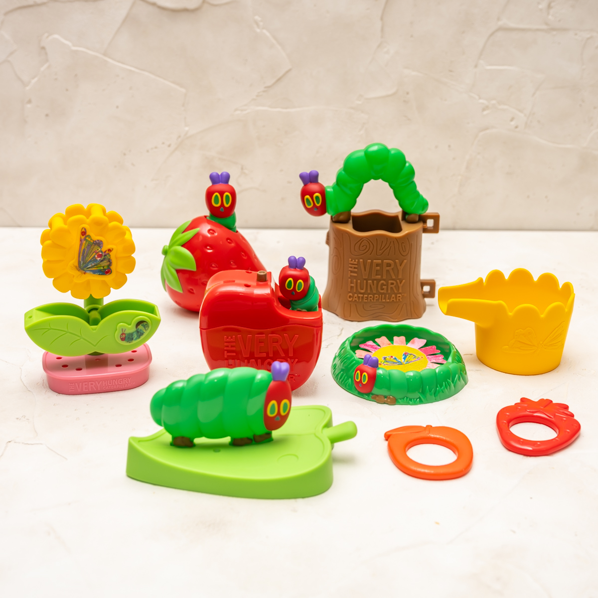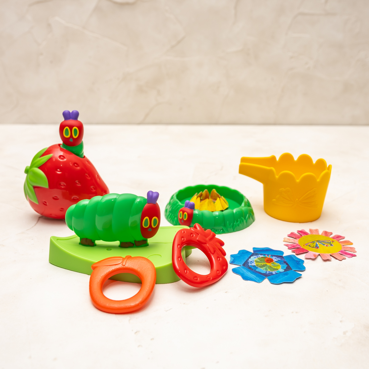 生命や自然科学への興味を広げてくれる、植物や昆虫の世界を想像しながら遊べる、「はらぺこあおむし」・ひまわり・いちご・りんごなどのカラフルなおもちゃです。