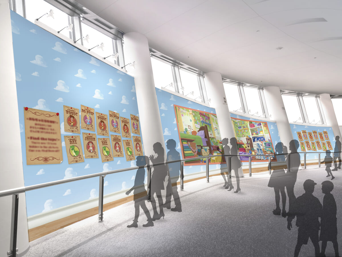 子ども部屋の壁には、おもちゃたちの紹介やフォトスポットがずらりと並びます。