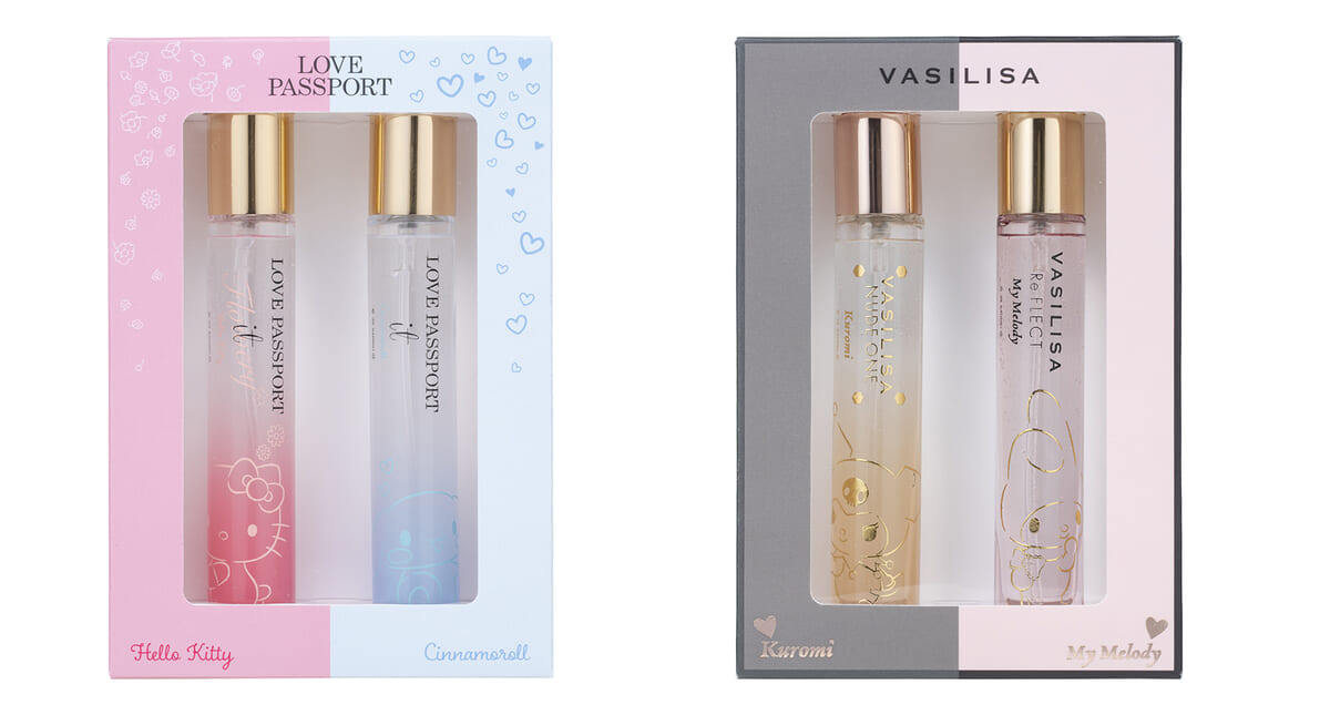 持ち運びやすい手のひらサイズの香水とパフュームスティックと、「ハローキティ」や「シナモロール」「クロミ」「マイメロディ」がコラボレーション。