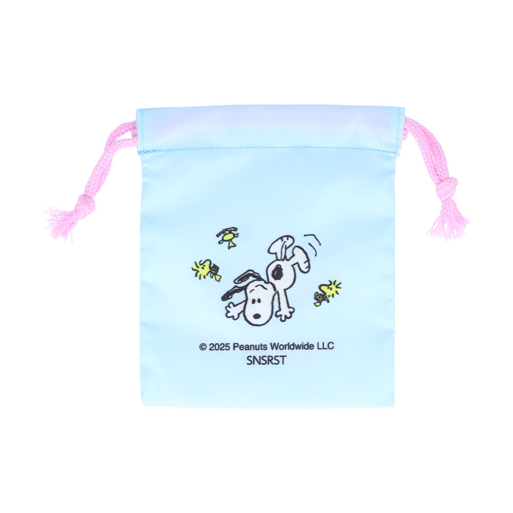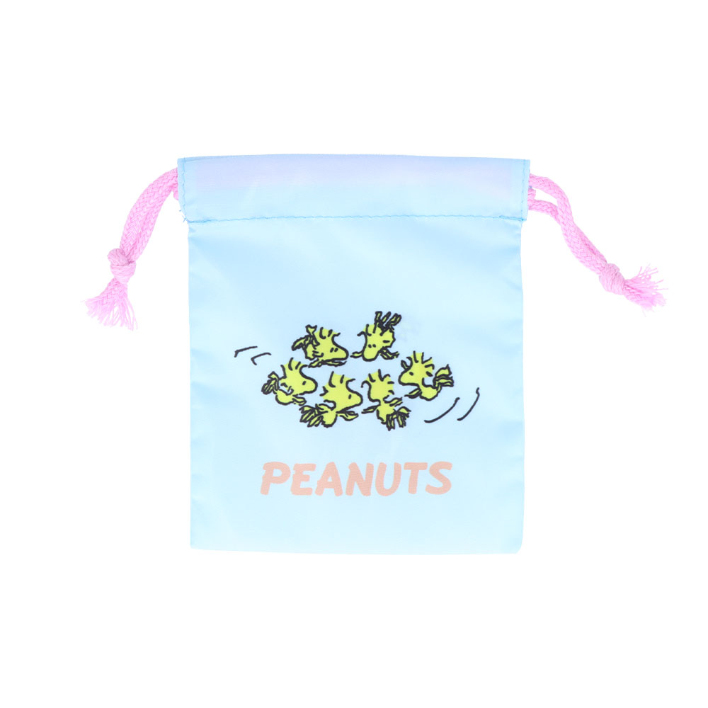 ライトブルーの生地に空を飛ぶ「ウッドストック」たちを描いた巾着は、