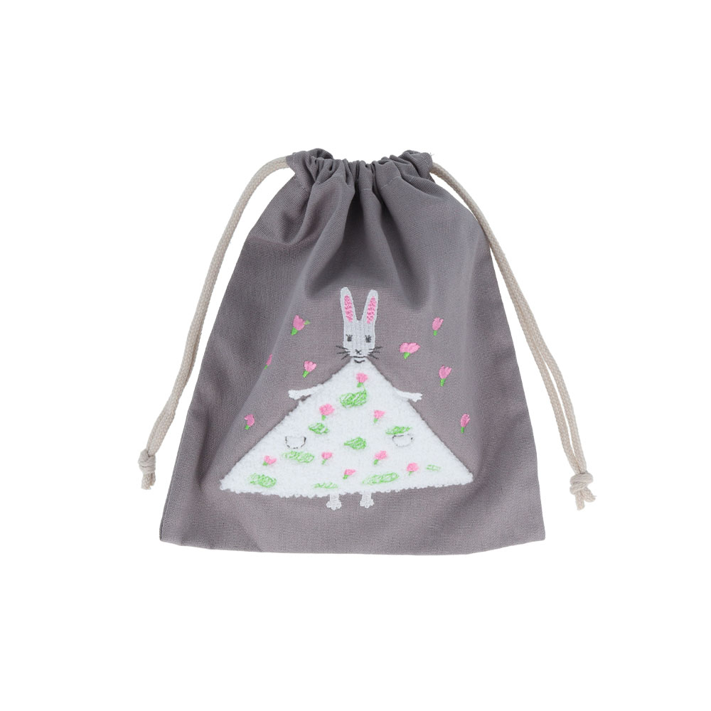 花柄になったワンピース部分をサガラ刺繍で表現した巾着。