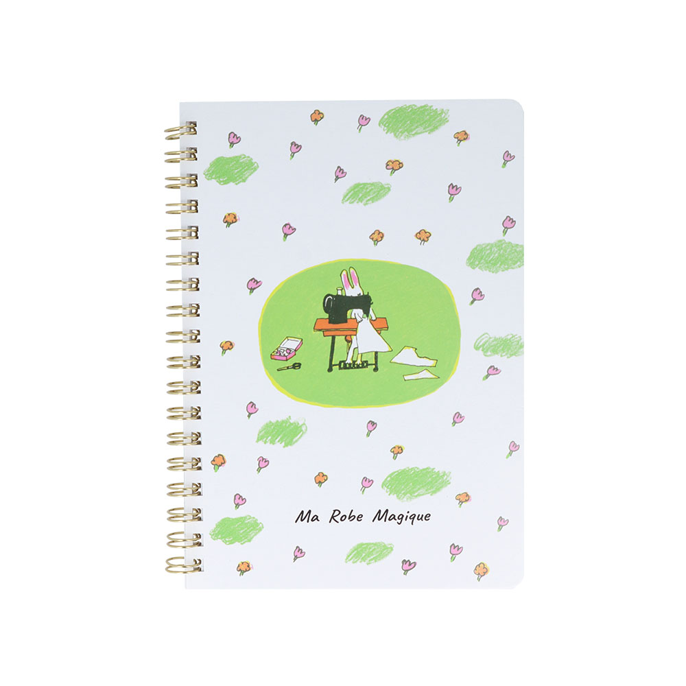 緑とお花に囲まれた中、ワンピースを作るシーンを表紙にあしらったリングノート。