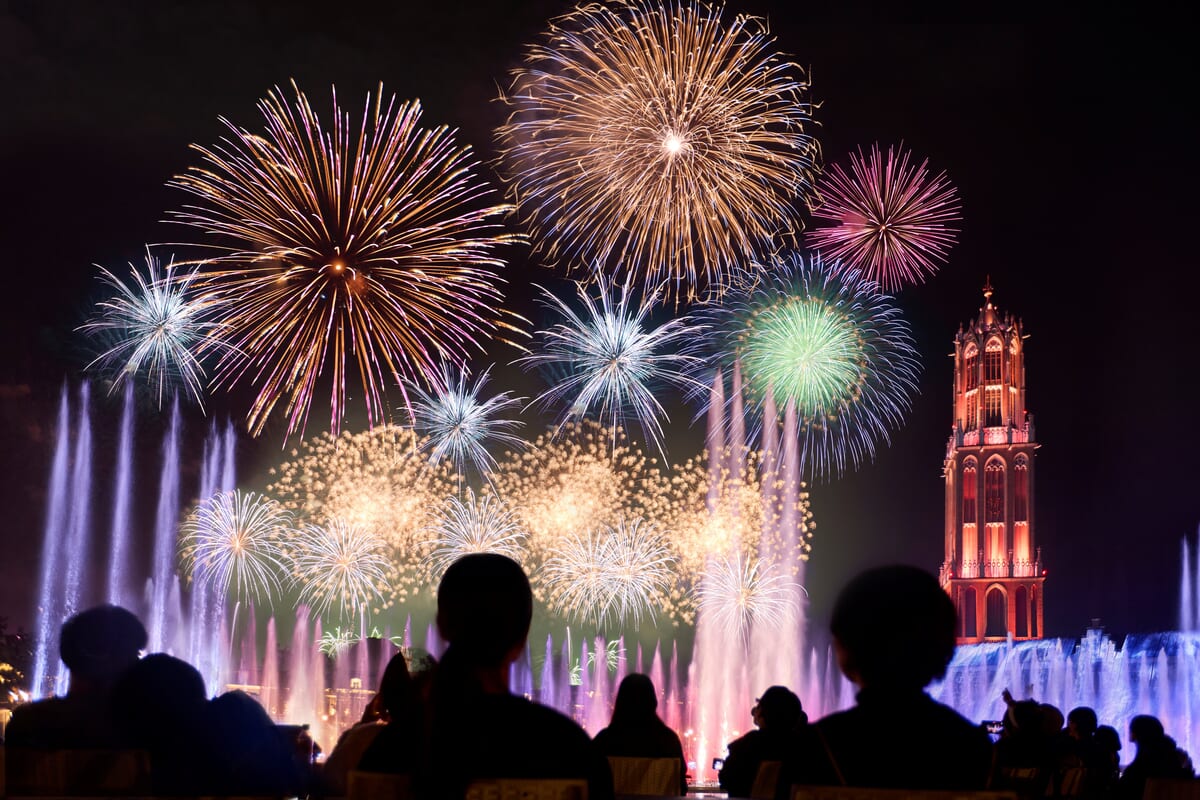 ヨーロッパの街並みの中で世界一のイルミネーションと日本最大の音楽噴水ショーとともに花火を楽しめます。