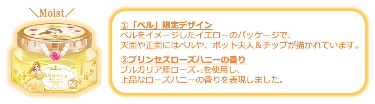 しっとりした使い心地で保湿ケアできる「モイスト」は、『美女と野獣』のディズニープリンセス「ベル」のデザイン。