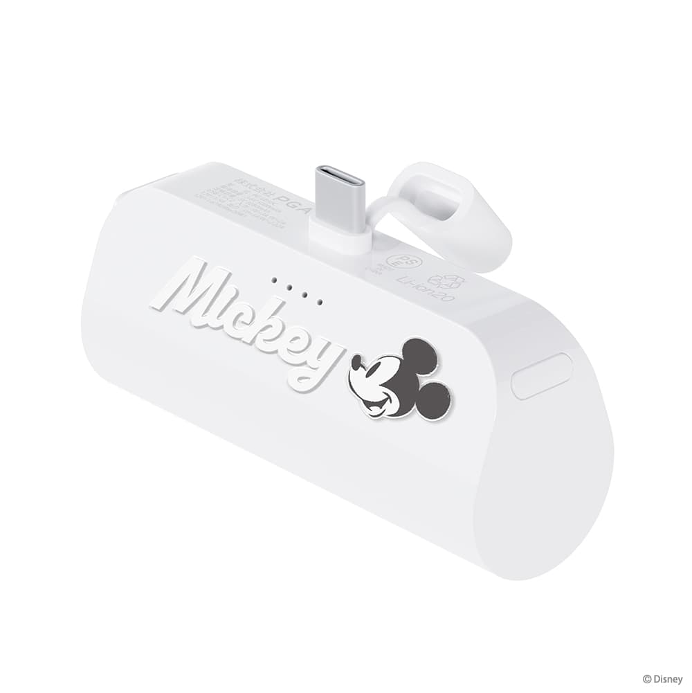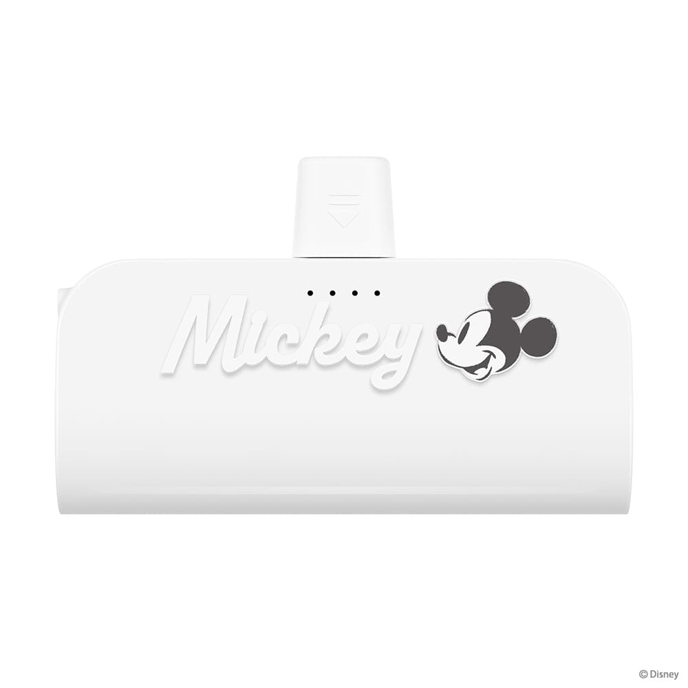 ホワイトの本体に、クラシカルな「ミッキーマウス」の横顔が映えるモバイルバッテリー。