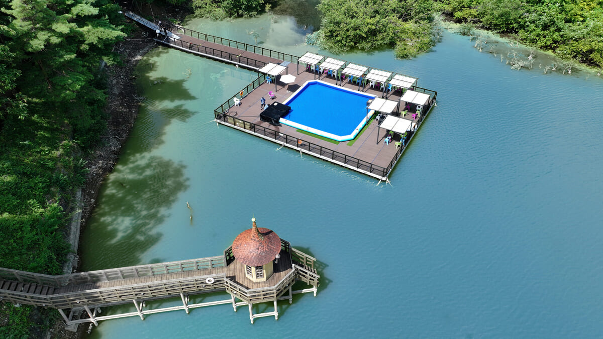 宮沢湖の上に16m×20m(320㎡)の巨大な浮島「湖上のテラス」が新登場しました。