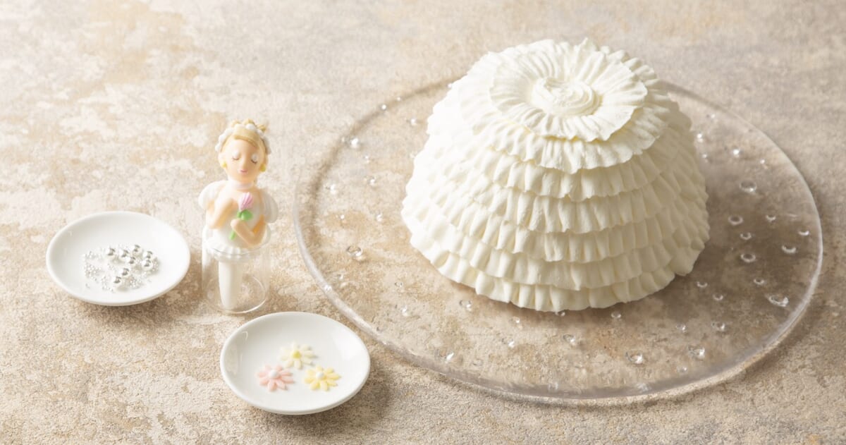 パティシエの繊細な絞り技術で一層ずつ丁寧に仕立てたドレスは、ふわりと軽やかな北海道産の生クリームシャンティで描かれ、まさにアートのような美しさ。