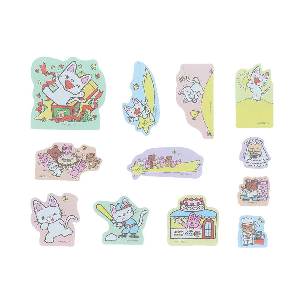 箱から飛び出す「ノンタン」や、みんなでケーキを囲むシーンなど、楽しいイラストのシールがアソートされています!