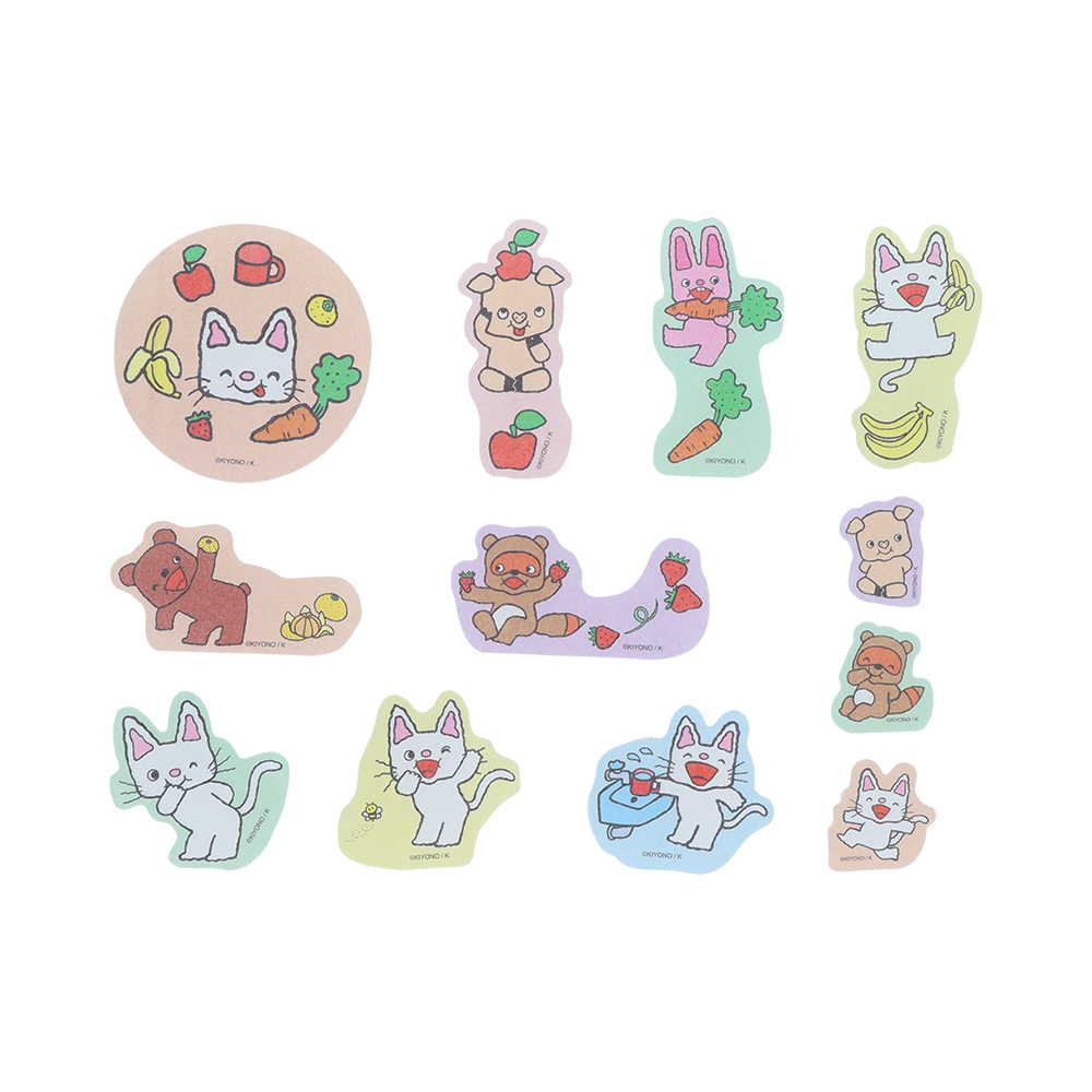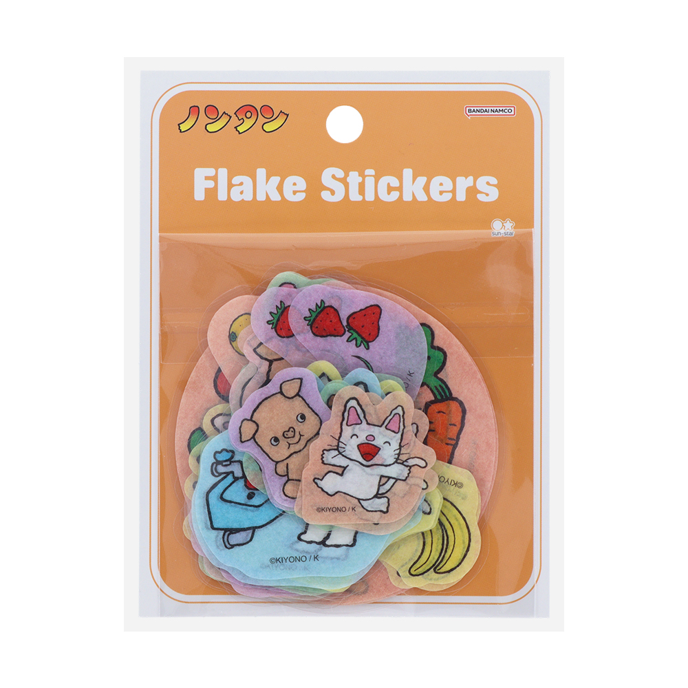 絵本『ノンタン もぐもぐもぐ』をモチーフにしたフレークシールには、食べもののイラストもたっぷり。