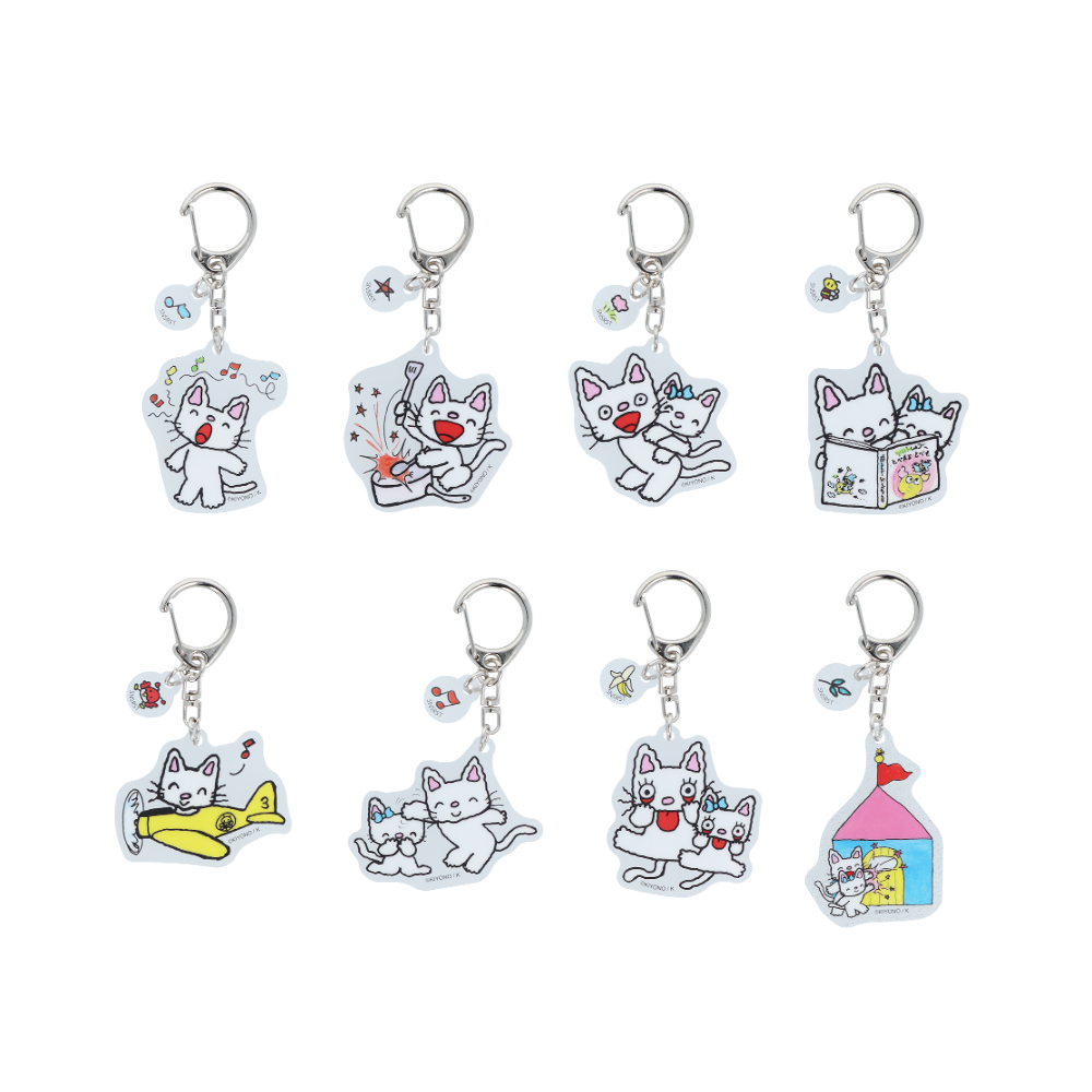 全8柄から、どれか1つが出てくる、ダイカットデザインのアクリルキーホルダー。