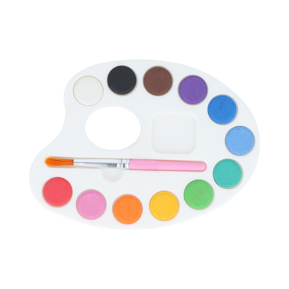 付属のパレットは、カラフル12色絵の具付き。