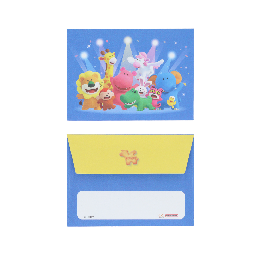 メモ欄には空を飛ぶ「ぺがさすちゃん」や、かっこよくポーズをきめる「らいおんくん」と「ぞうくん」が描かれています。