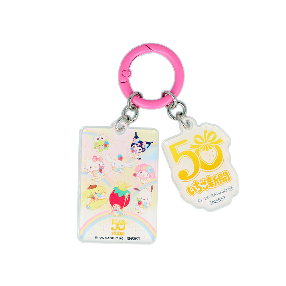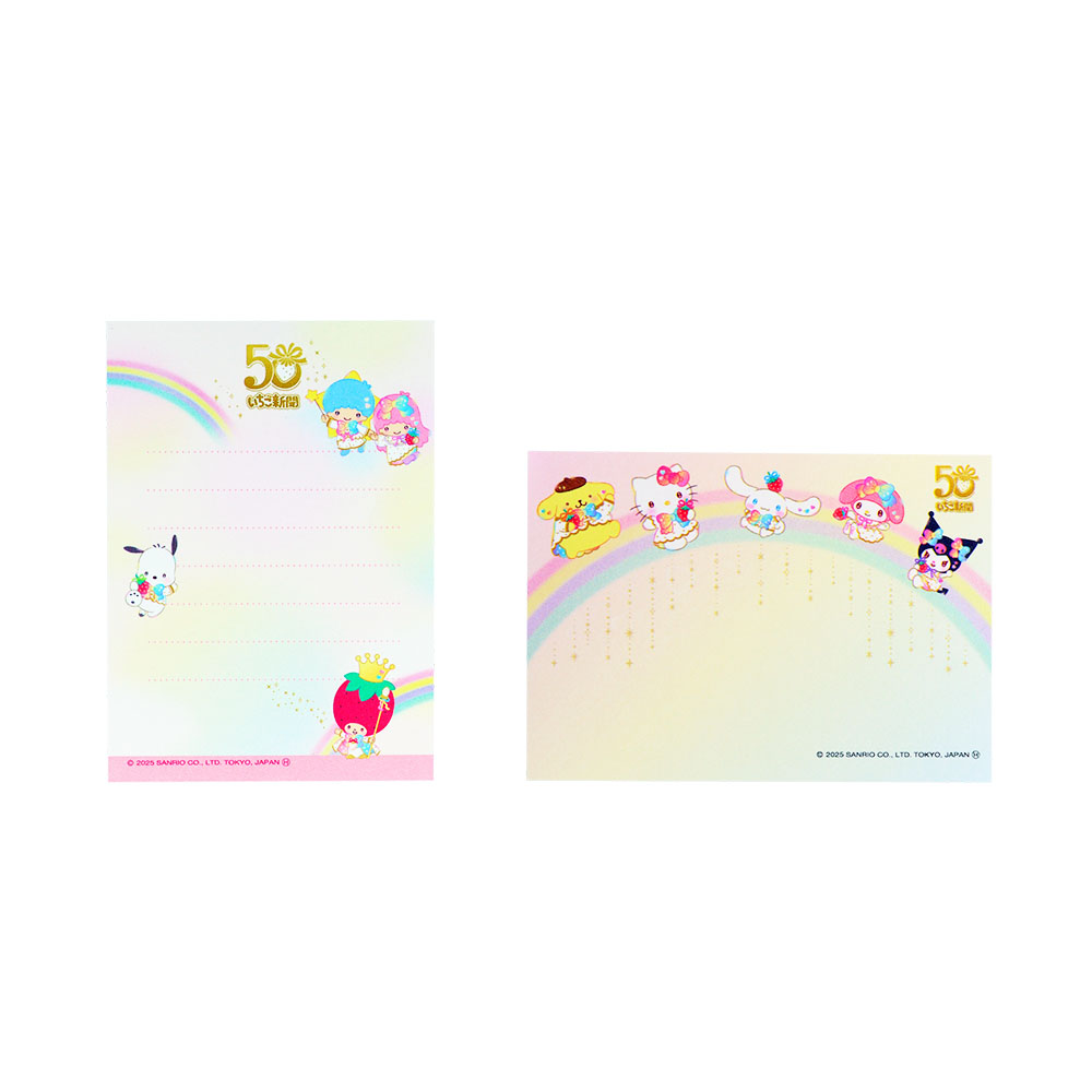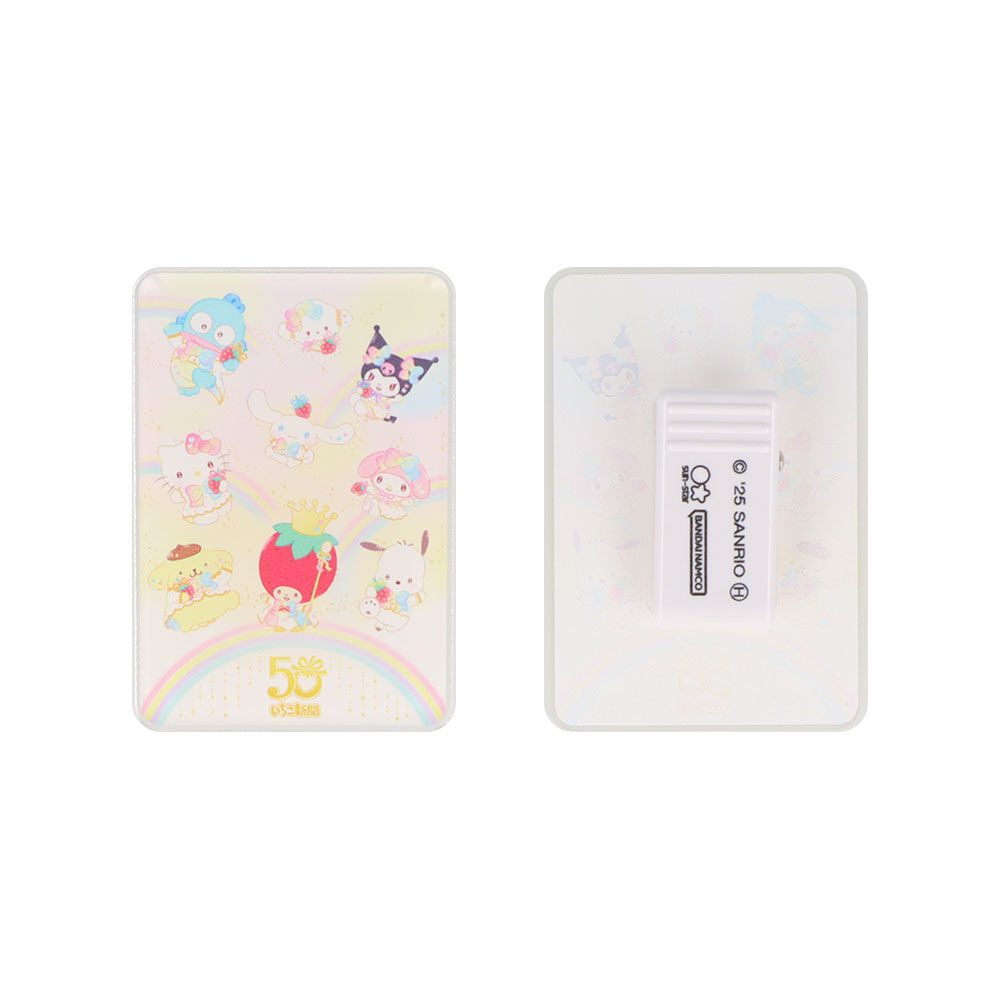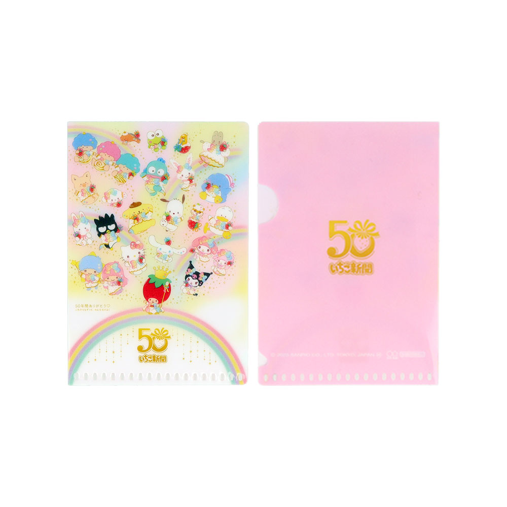 50周年記念ロゴと「いちごの王さま」やサンリオキャラクターたちが大集合したデザインが楽しめます。