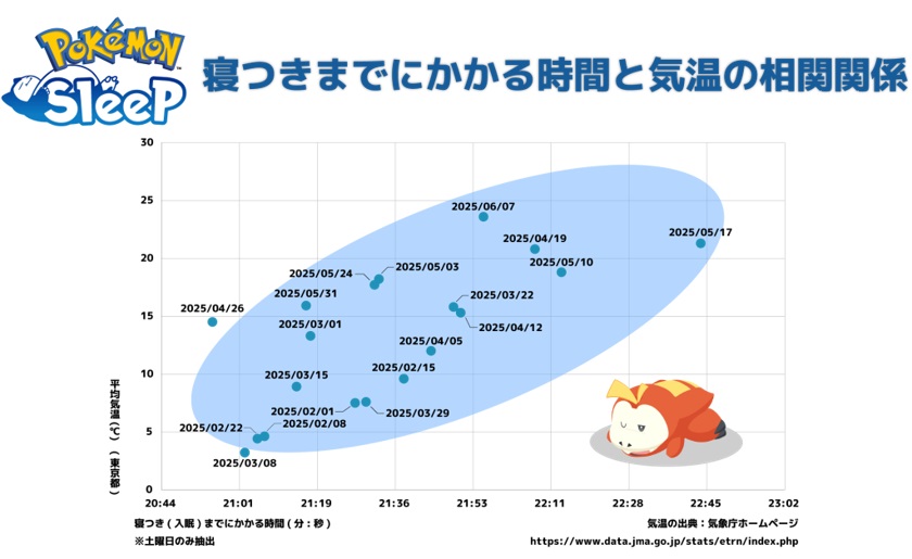『Pokémon Sleep』のユーザーデータによると、5月末から6月にかけて徐々に気温があがり、就寝にかかる時間が⻑くなることを観測。