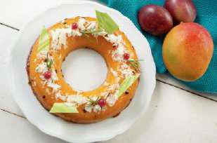 マンゴーとパッションフルーツをたっぷりと練り込んだ生地は、しっとりとした口あたりとともに、果実の甘みと酸味がふわりと広がる仕上がり。