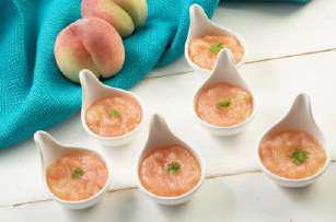 とろりとなめらかな杏仁豆腐に、果肉の存在感をしっかりと残した桃のソースを重ねた一品。