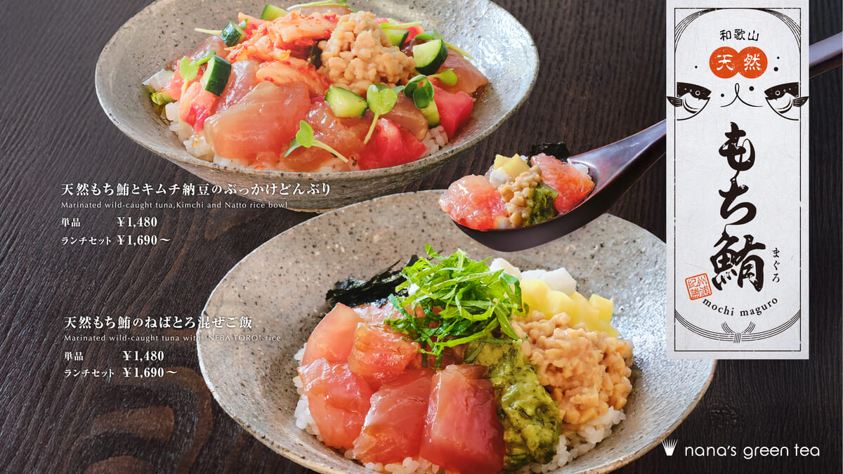 nana’s green teaの売上額No.1人気メニュー「天然鮪とアボカドのとろろどんぶり」と同じ、紀州・那智勝浦港で水揚げされた天然の「もち鮪」が使用されています。