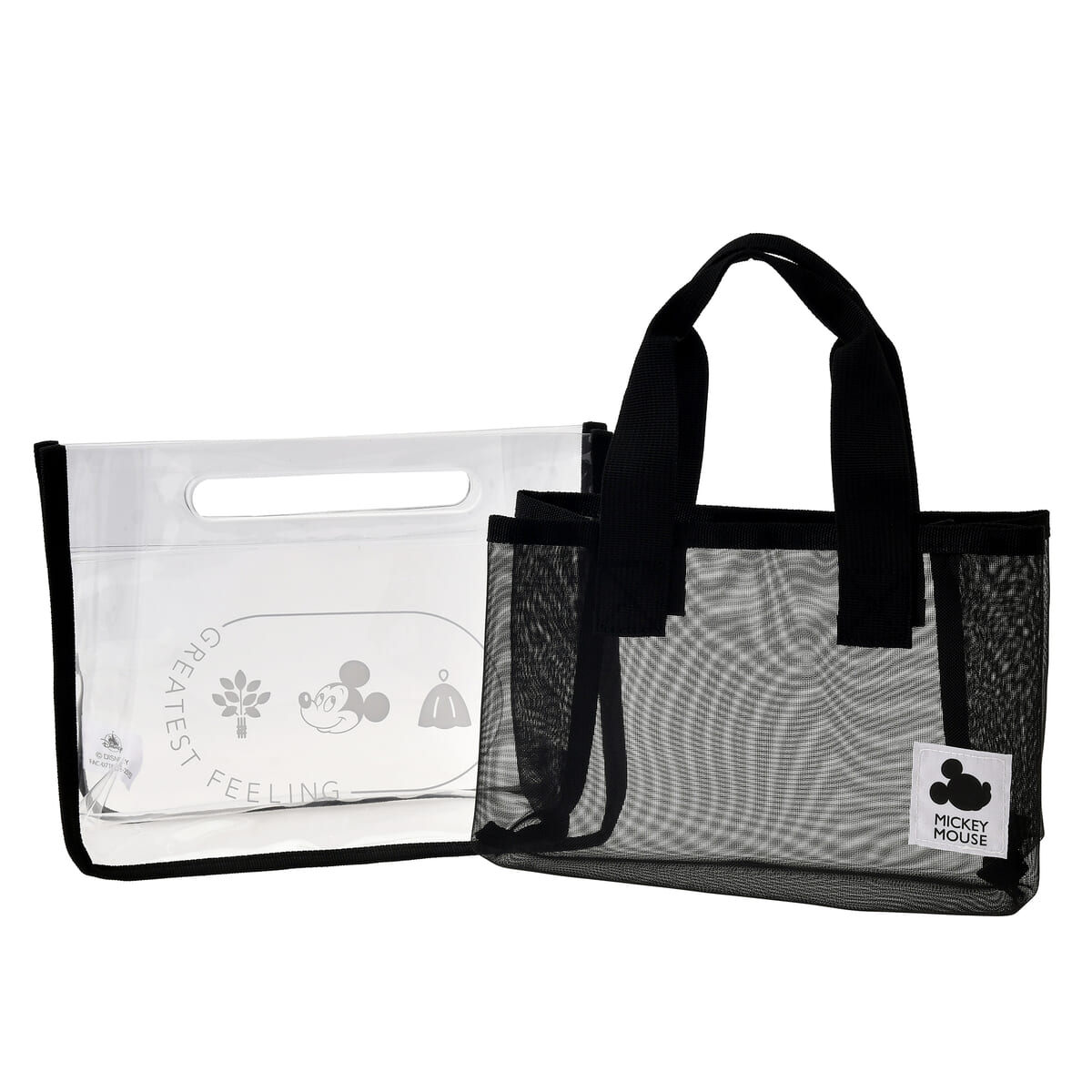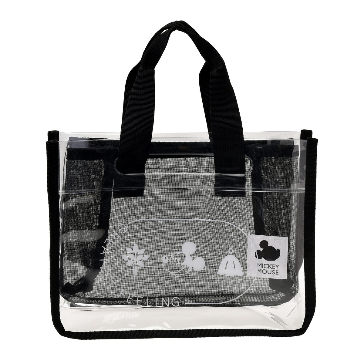 クリアバッグには「ミッキーマウス」のお顔やサウナハット、メッシュバックにはフェイスシルエットのタグがあしらわれています。