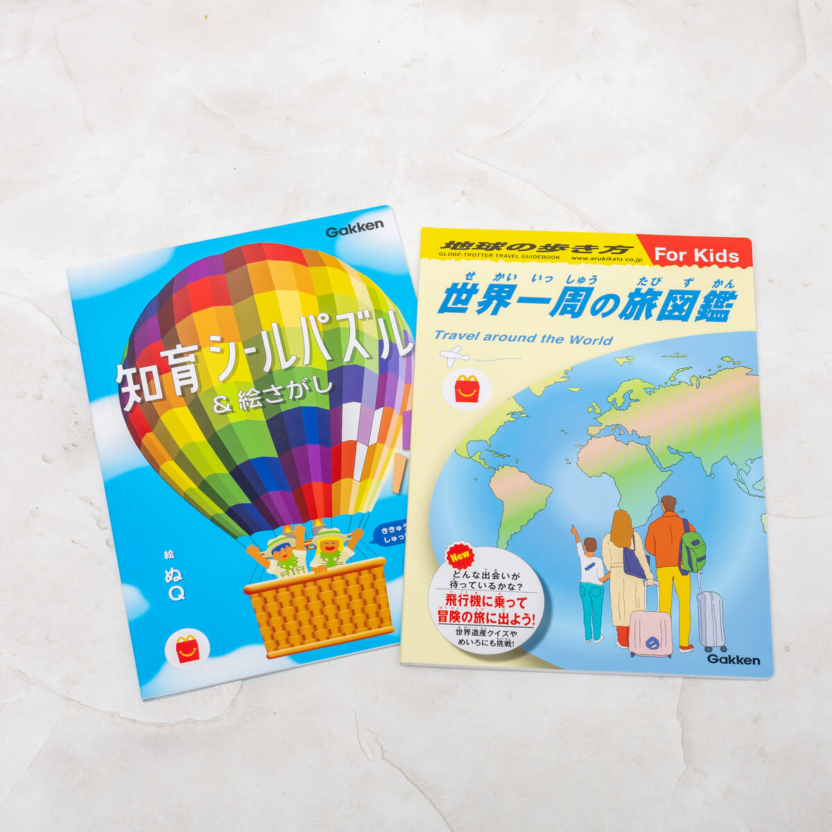 マクドナルド「ほんのハッピーセット」絵本「知育シールパズル&絵さがし たんけん!ハッピーセット オリジナル編」/ミニ図鑑「地球の歩き方 For Kids 世界一周の旅図鑑」