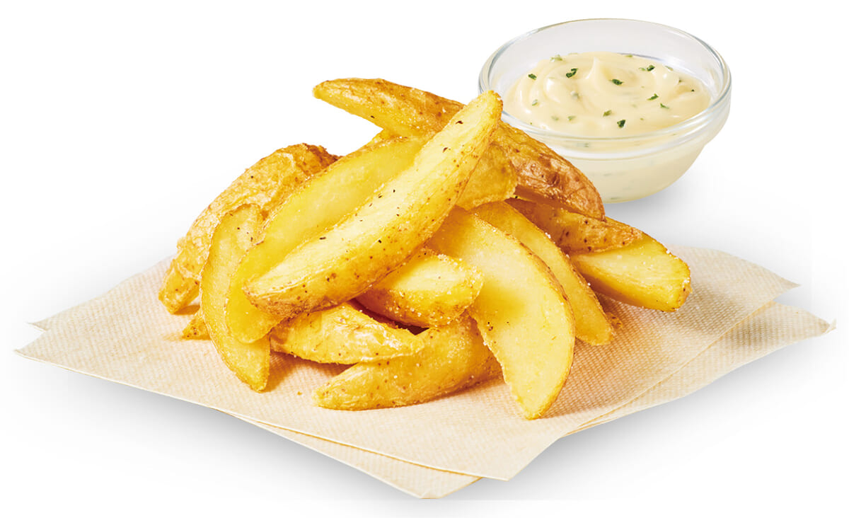 注文を受けてから作る揚げたてアツアツの北海道十勝産「北海こがね」の皮付きフライドポテトにディップして味わうことができます。