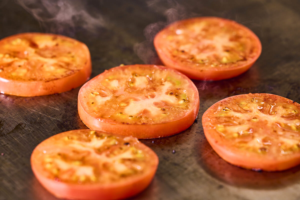 ハンバーガーに使用されている厚切りトマトは、瑞々しさを残しつつグリルする事で甘みを凝縮しています。