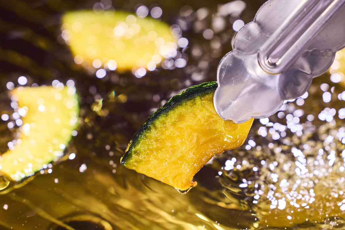 かぼちゃは、素揚げにすることで、自然な甘さとホクホク食感を引き出しているのがポイント。