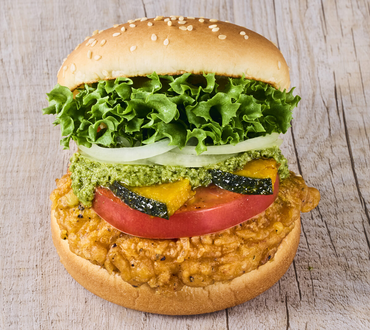 サクサクのフライドチキンとたっぷりの野菜を使用した「国産夏野菜のバジルチキンバーガー」