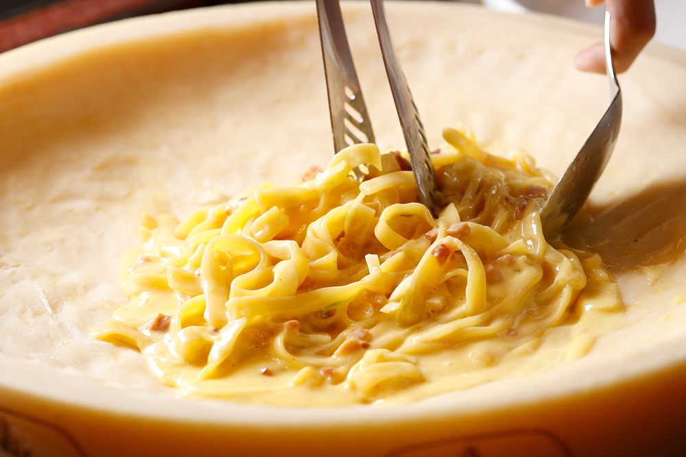 かぼちゃのクリームソースパスタをチーズに絡めて仕上げる「ハロウィーンパスタ」は、ライブキッチンで出来立てを提供。