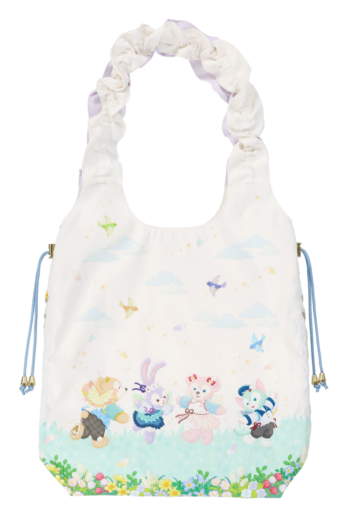 優しい色合いのショルダーバッグは、ダッフィー、シェリーメイ、ジェラトーニ、ステラ・ルー4人のアップリケ刺繍がついており、パークでも日常のコーディネート使いにもぴったり☆