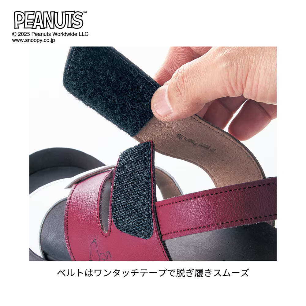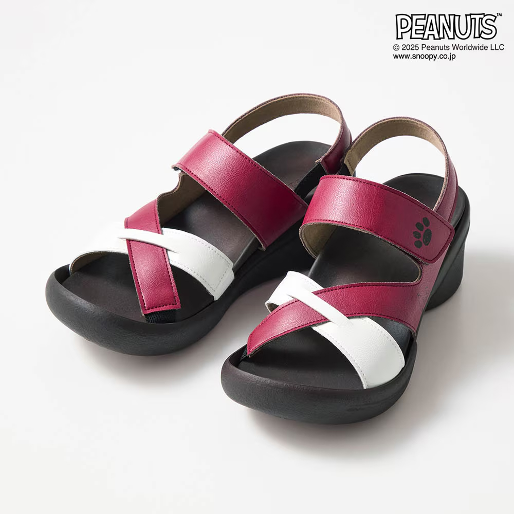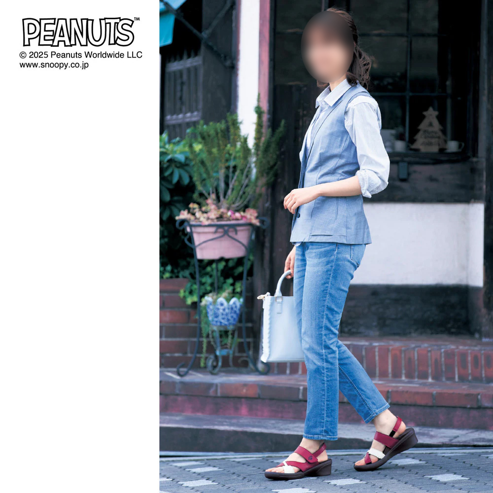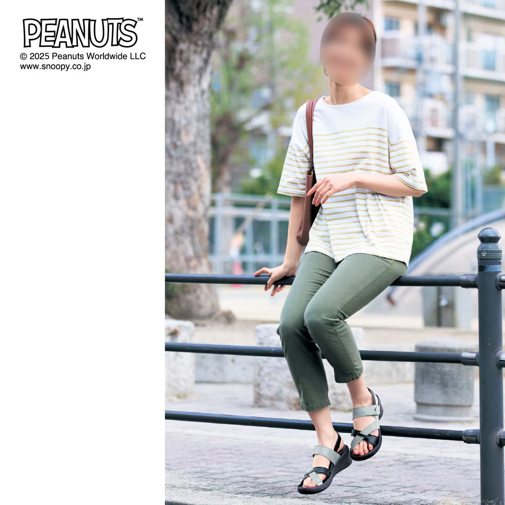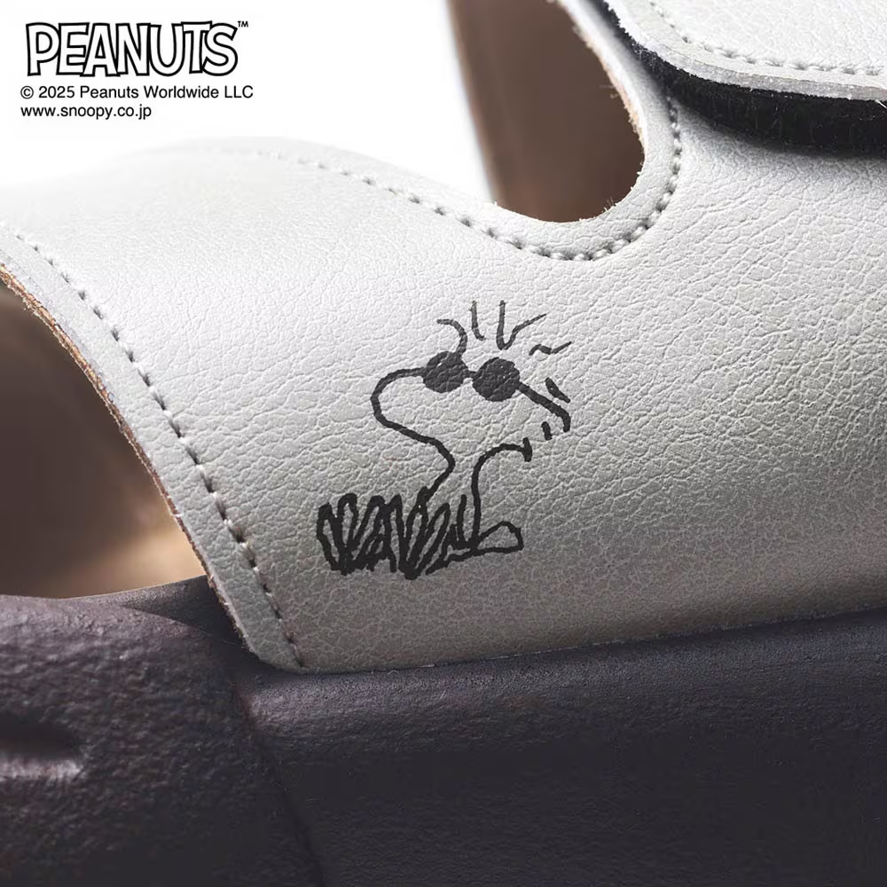 ホワイトとレッドの組み合わせが新鮮な「スヌーピー」のサンダルが、コーディネートに取り入れられます。
