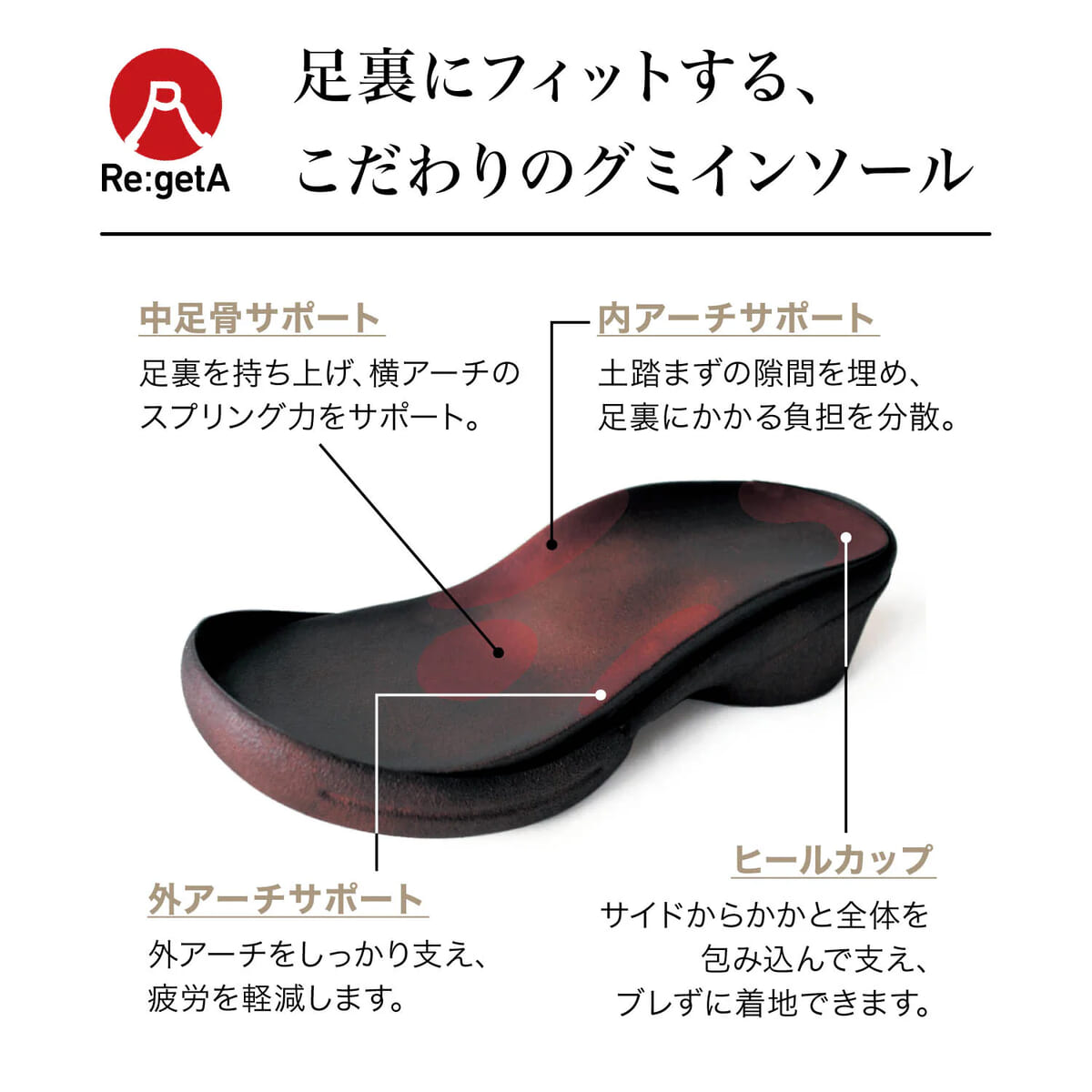 足裏全体を使って支えることで歩行時の負担を軽減します。