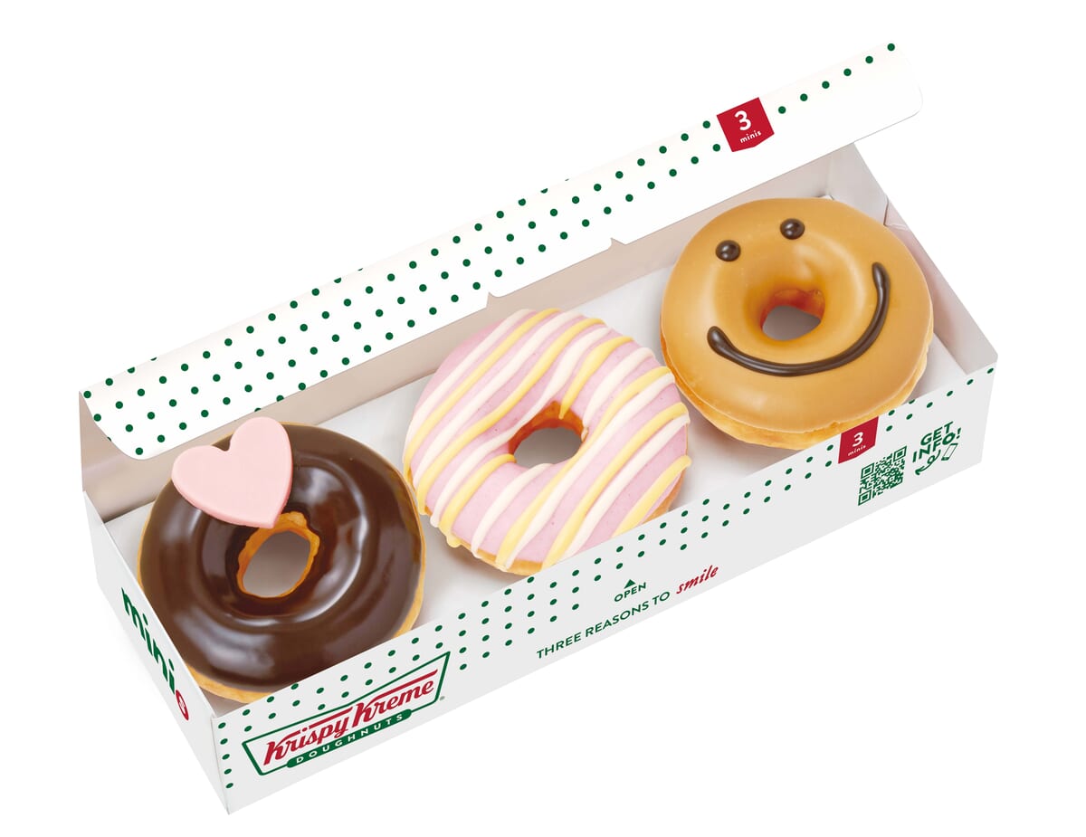 教材に登場するドーナツと同じモチーフを飾ったミニ チョコ ハート、ミニ キャラメル スマイル、ミニ ストロベリー&カスタードの3種類がアソートされています。