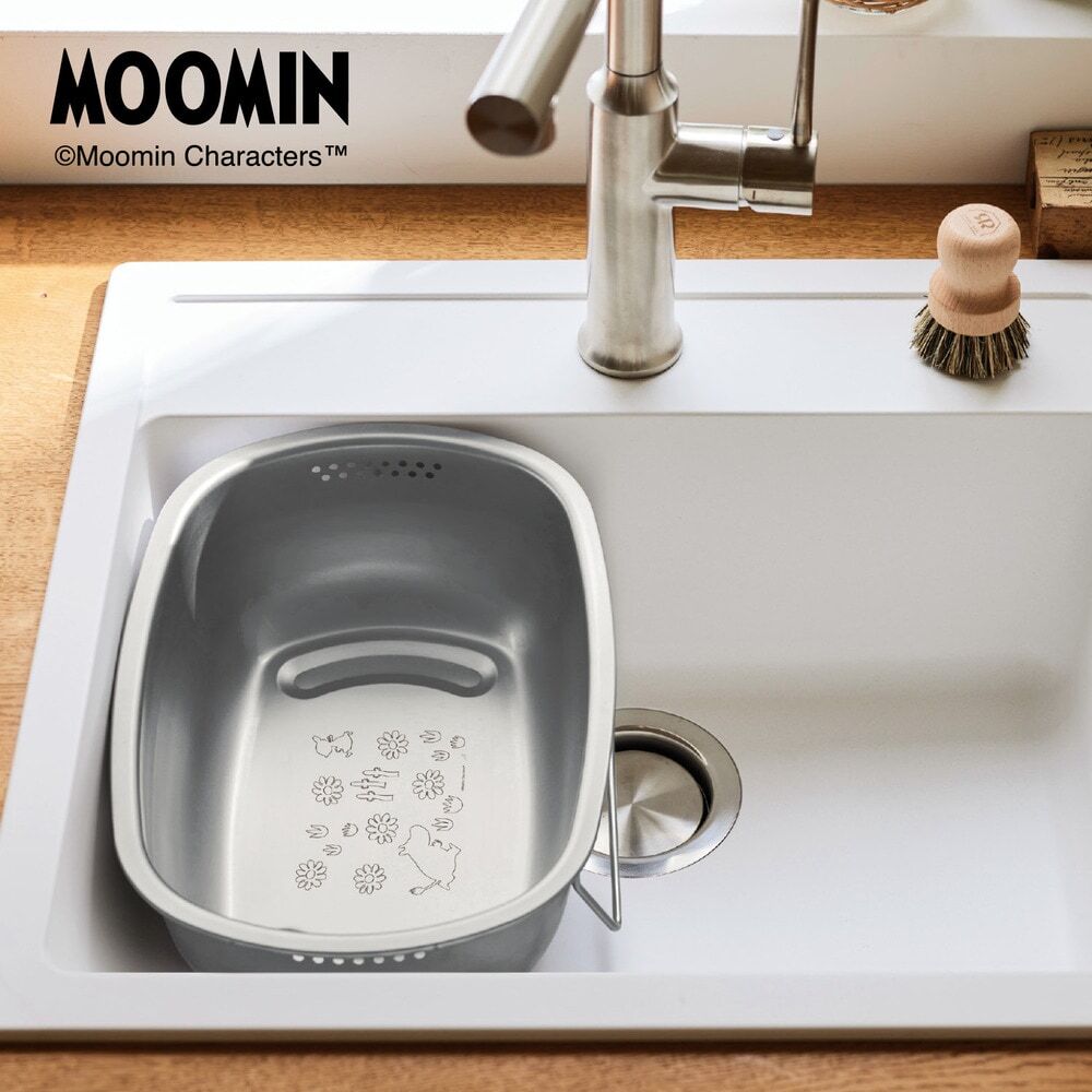 ベルメゾンの「ムーミン」洗い桶は、18-8ステンレス製でサビにくく、きれいに長く使えるキッチングッズ。