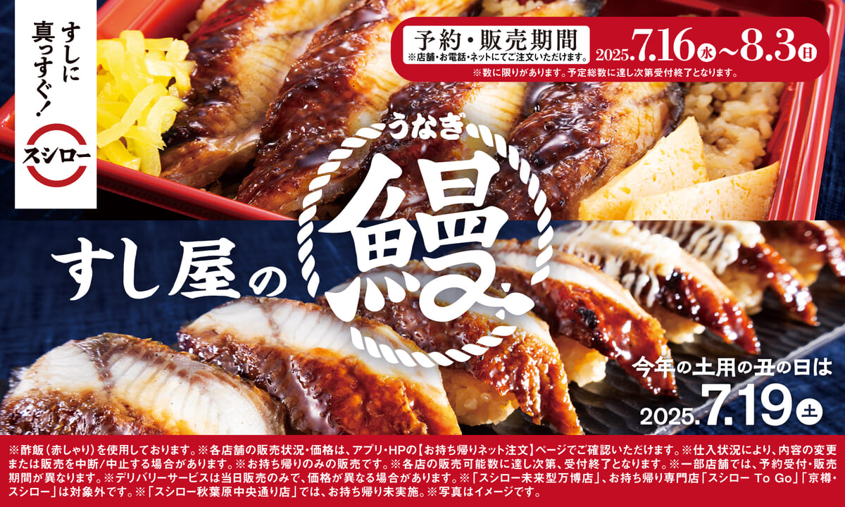 持ち帰りの「土用の丑の日」メニューは、全国のスシローにて、2025年7月16日(水)から8月3日(日)まで販売されます。
